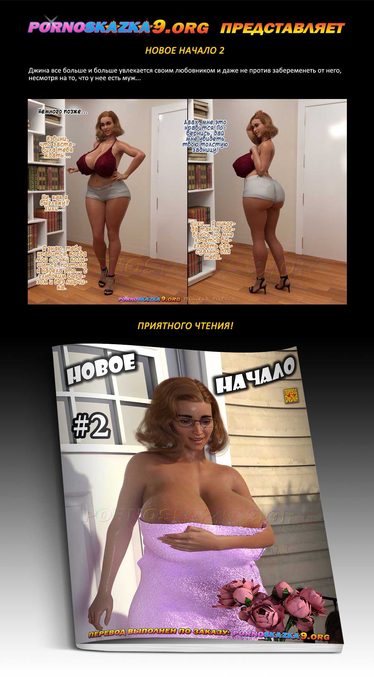 Порно комикс «Новое начало. Часть 2.» Джина все больше и больше увлекается своим любовником и даже не против забеременеть от него, несмотря на то, что у нее есть муж…
